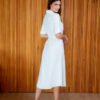 Vestido chemise em viscose com mangas ajustáveis e bolsos. Comprimento midi e barras