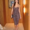 O vestido é confeccionado em Tule. A peça contém um caimento justo ao corpo e marca a silhueta feminina de maneira elegante. O modelo midi possuí franzidos nas laterais e no busto, além de alças acetinadas com regulagem e um zíper invisível na parte posterior.